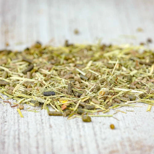 Leinsaatspelzen, Soja-Extraktionsschrotfuttermittel (aus genetisch verĂ€ndertem Soja hergestellt), Luzerne, Kartoffelprotein, Weizenfuttermehl, Tef, Timotheegras, LuzernestĂ€ngel, RĂŒbenmelasse, Weizenkleie, Ackerbohnenflocken, KarottenstĂŒckchen, Bockshornklee, Calciumcarbonat