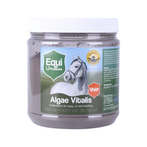 Algae Vitalis von Equi Protecta ist ein Ergänzungsfuttermittel für Pferde und Ponys. Das Supplement enthält unter anderem naturbelassenen, karbonisierten Humus, Mineralstoffe und probiotische Algen, die aus dem Wattengebiet stammen. Algae Vitales trägt zur Optimierung der Darmflora und zur besseren Aufnahme von Nährstoffen bei und fördert die Ausscheidung von Giftstoffen aus dem Körper des Tieres. Darüber hinaus unterstützt die Ergänzung die Darmfunktion und hat eine beruhigende Wirkung.