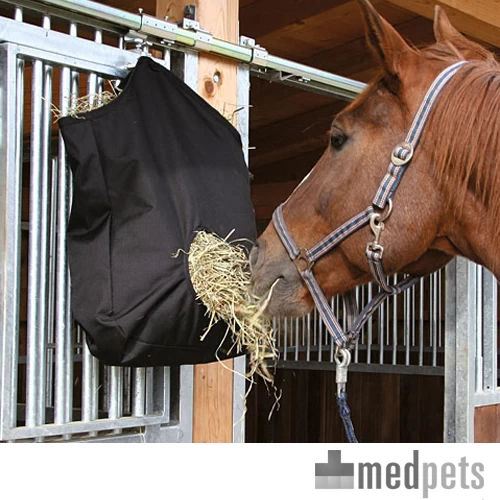 Dieser Heusack von der Marke Kerbl ist ein praktischer Sack, um Heu fĂŒr Ihr Pferd oder Pony hineinzutun. Er ist ideal zum Mitnehmen auf ein Turnier oder auch fĂŒr den Einsatz wĂ€hrend des Transports von dem Tier. Der Sack besitzt eine runde Ăffnung, durch die das Pferd das Heu herausholen kann. Sie können den Heusack sehr einfach ĂŒber die Ăffnung entlang der Oberkante von dem Beutel mit Heu befĂŒllen. Das Produkt ist aus Polyamid gefertigt und wird mit zwei praktischen Ringen zum AufhĂ€ngen liefert.